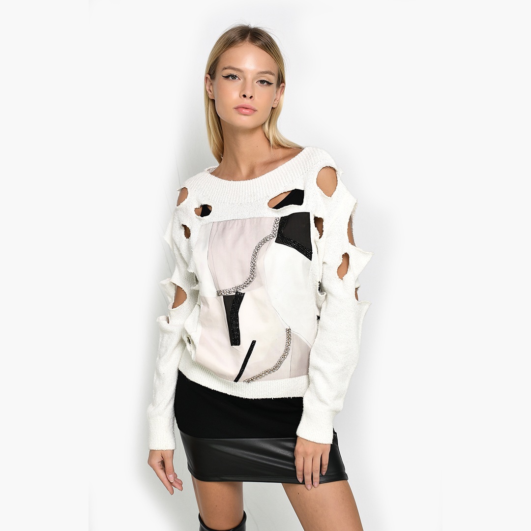 Μπλούζα μακρυμάνικη με τρύπες φαρδιά λαιμόκοψη και στάμπα διακοσμημένη με stras